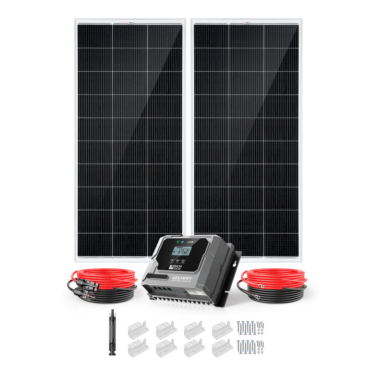 Rich Solar’s 400-Watt Solar Kit is a high-capacity off-grid solution for RVs, trailers, boats, and mobile energy systems. It includes four high-efficiency 100W monocrystalline solar panels with 9 busbars and a 40A MPPT charge controller capable of handling up to 600W. Designed for 12V and 24V battery banks, this kit features plug-and-play wiring with MC4 connectors, LCD display, and LED indicators. UL certified and built for rugged environments, it’s ideal for expanding your mobile or backup power setup.