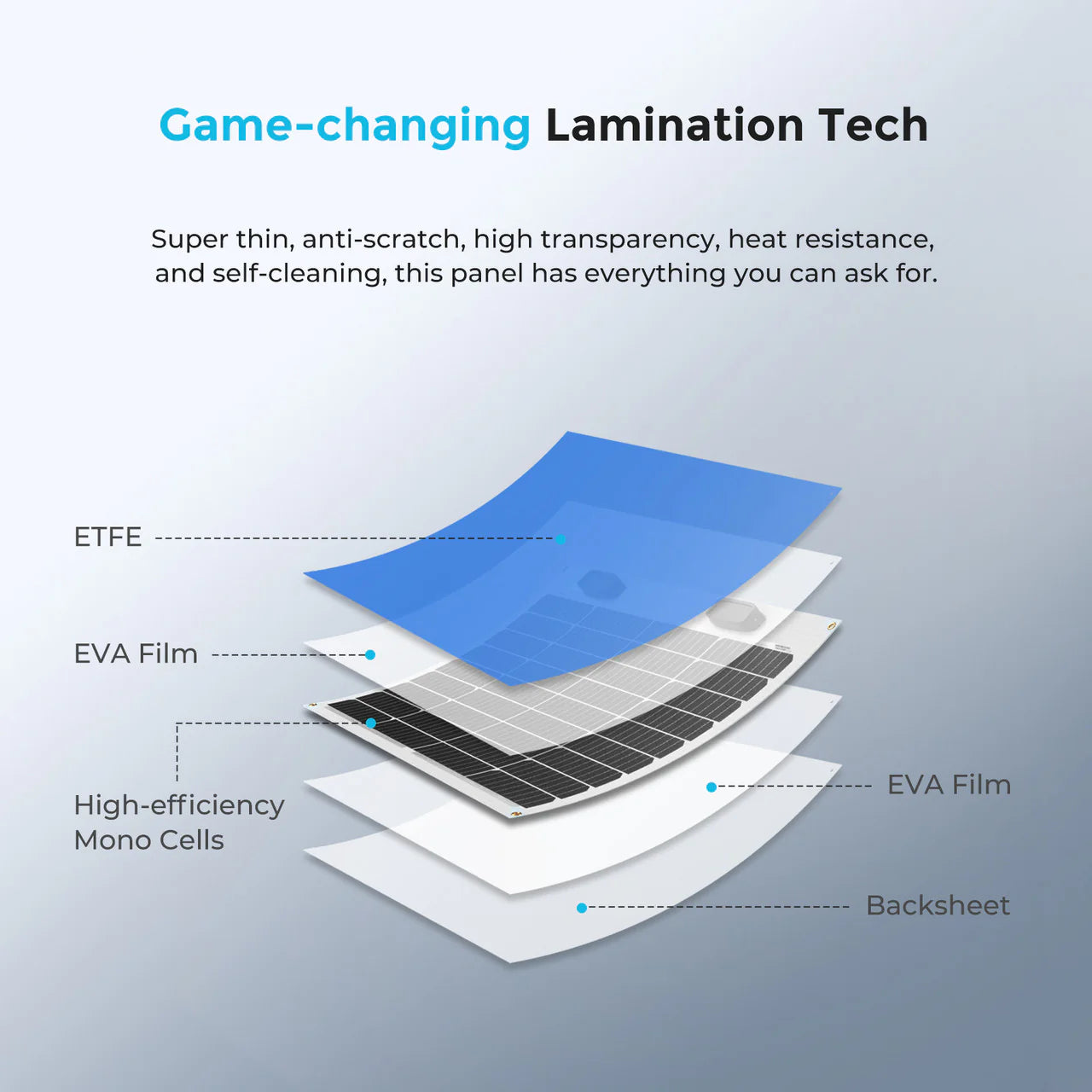 The Renogy 50W Flexible Solar Panel is designed for lightweight, low-profile installations on curved surfaces. Weighing just 2.87 lbs and less than an inch thick, it bends up to 240° and features high-efficiency monocrystalline cells with ETFE lamination. Ideal for tents, boats, RVs, and portable off-grid setups, it’s IP68 waterproof and built for rugged outdoor use.
